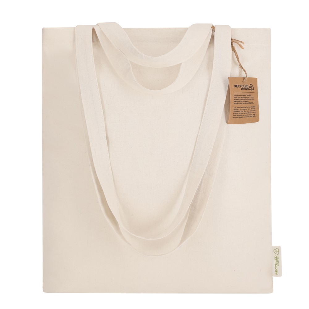 Entdecken Sie die kraftvolle Einkaufstasche aus 140 g/m² recycelter Baumwolle – der ideale Imageträger für Ihr Unternehmen! Mit den großzügigen Maßen von 36 x 40 x 12 cm und einem Gewicht von gerade einmal 95 g ist diese Tasche nicht nur leicht, sondern auch besonders widerstandsfähig: Sie hält bis zu 6 kg. Die doppelt genähten Griffe bieten sowohl Komfort als auch Stabilität und machen sie zum perfekten Alltagsbegleiter.